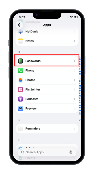 Scroll down to the letter P, then tap on Passwords from the list of apps. You can use the search function to make things easier if you like.