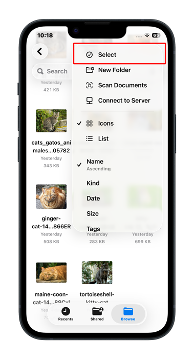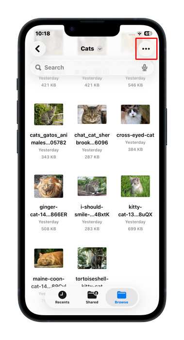 We need to select the files we want to import. To do that, we must enter selection mode. To do that in the files app, we first tap the menu button:-
