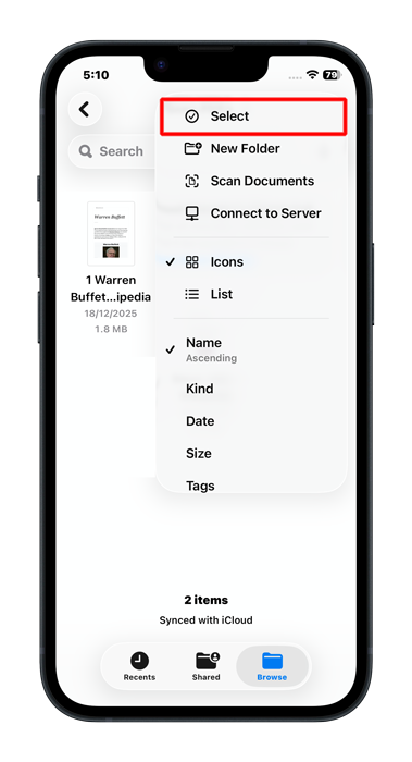 We need to select the two PDF files, for that, tap on the 3 dots at the corner of the screen, then tap Select from the menu.